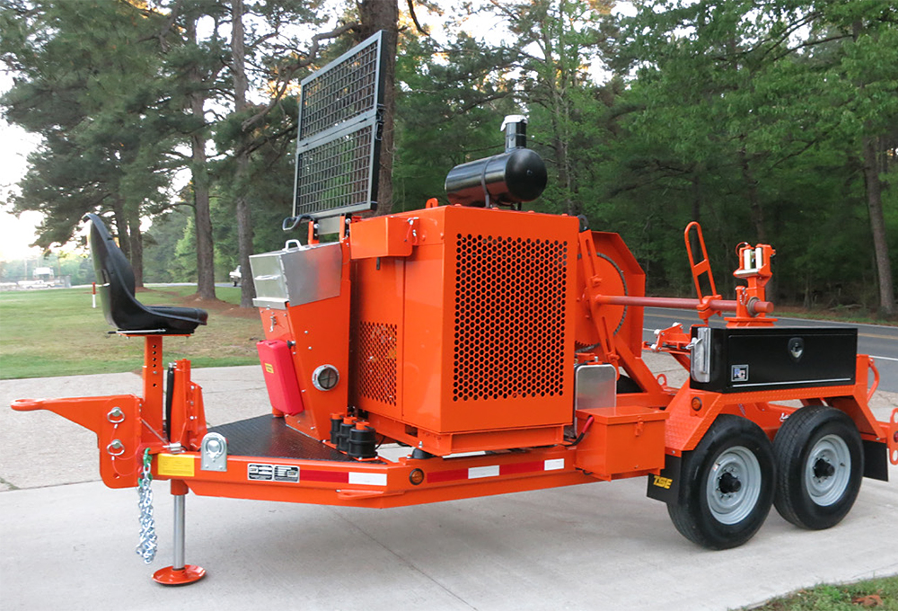 The TSE Model DPT-50B is a heavy duty drum puller designed for distribution conductor installation. The reel drive incorporates the latest in hydrostatic transmissions that allow the operator to infinitely vary the linespeed and linepull for safe, positive control during the pulling operation. The maximum desired linepull can be preset prior to pulling so that the reel drive will stall if a restriction to the line occurs avoiding damage to the conductor, towers and hardware. In the tensioning mode, the hydraulic system permits the line to be pulled at a steady and controlled tension with automatic pull back to keep the conductor suspended if the pulling force is reduced.