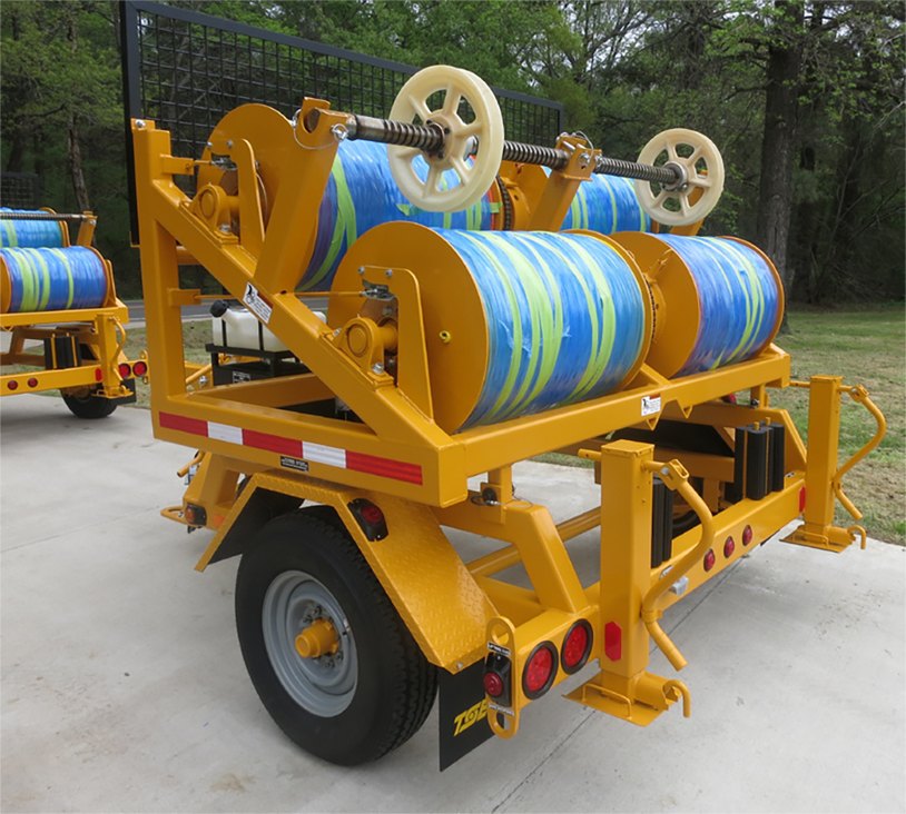 The DP-10-4H is a compact and portable hydraulically powered 4 drum puller. Designed as a light distribution puller, it can also serve as a pilot line winder. The pulling unit can be removed from the trailer and pole mounted with power supplied by the integral power-pack or from a line truck. Power is transmitted to the drums through a common drive train. A diamond leadscrew levelwind, accommodating one reel at a time, provides an even wrap during the pull. Individual overspin brakes can be controlled manually or with a hot stick.